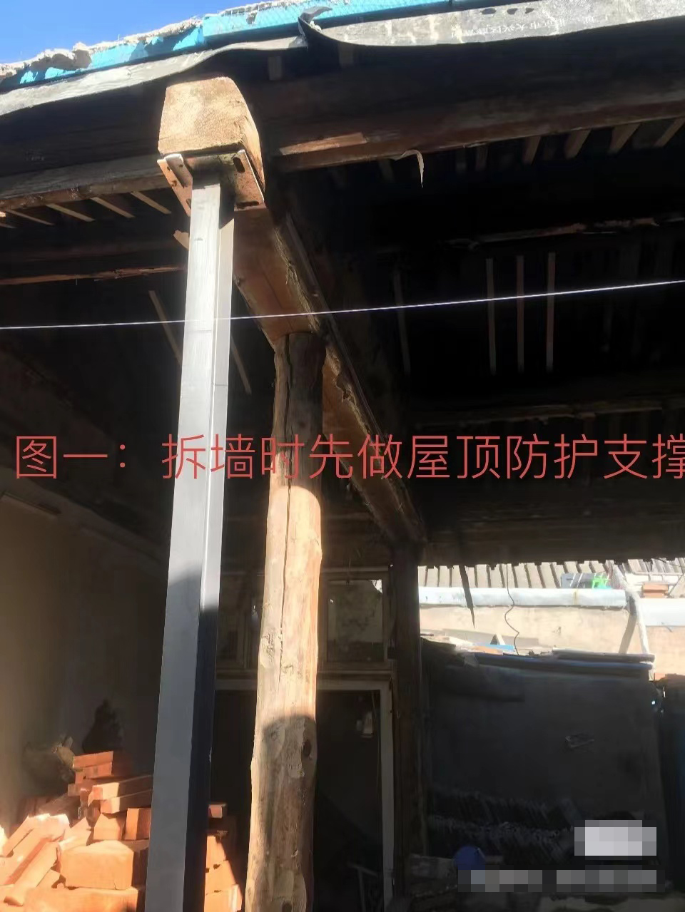 1 在旧墙两侧设置顶升措施,固定房梁屋架,然后进行拆旧墙换新墙。